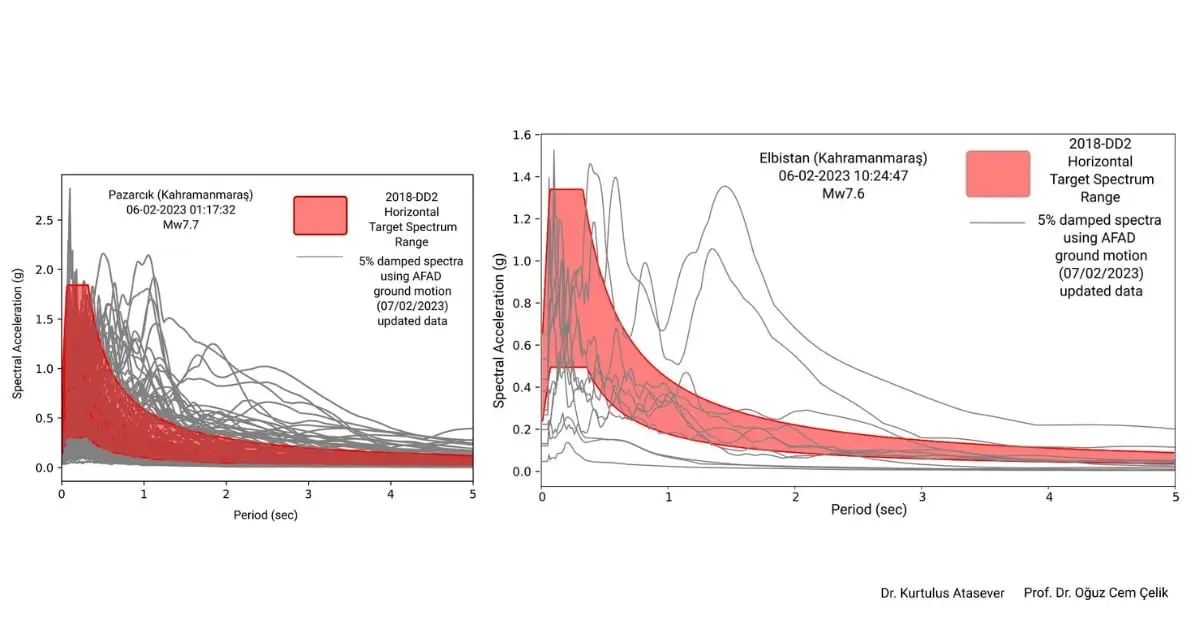 The moment magnitude of the mainshock was determined as 7.7 at an epicenter depth of 8.6 km. This earthquake recorded high spectral acceleration values, challenging the design capabilities of many structures. Earthquake engineers Prof. Dr. Oguz Cem Celik and Dr. Kurtulus Atasever compared these values with code-based spectra and confirmed that most buildings experienced accelerations far exceeding their design limits.
