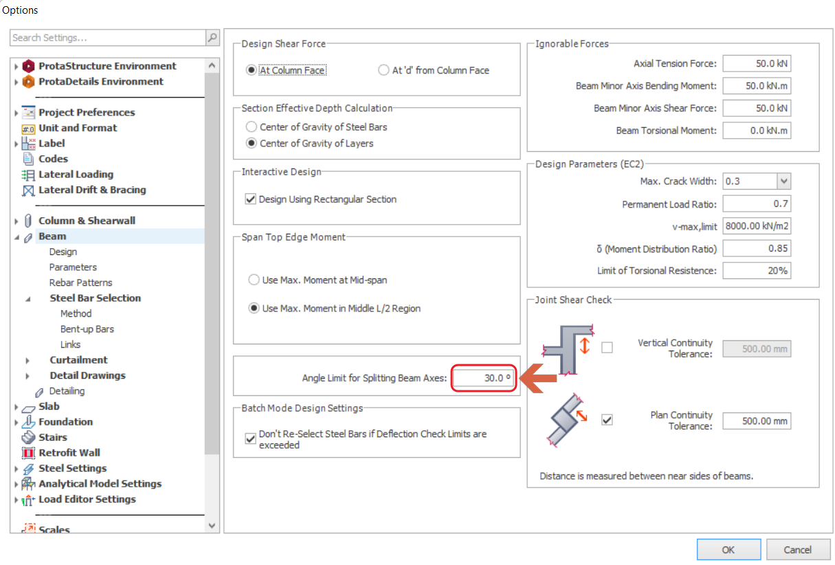 Only beams axes exceeding the set angle will be split to separate design & detailing axes.
