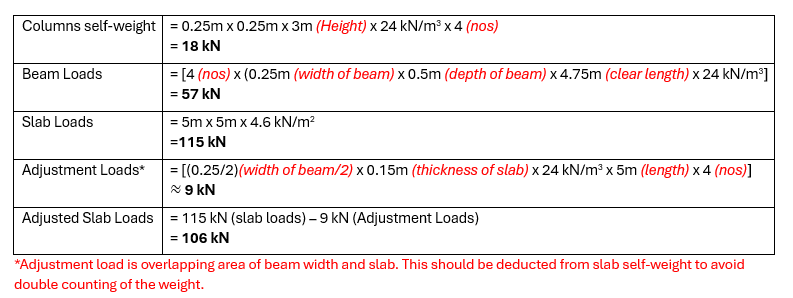 Decomposed Slab Load = (A1 + A2 + A3 + A4) kN/m2 <Please refer to diagram> – adjustment loads