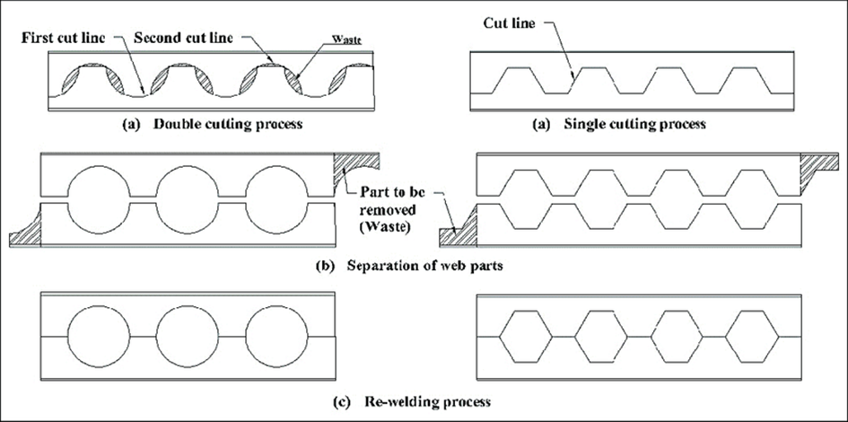 openings in the web section, with common shapes including hexagonal, circular