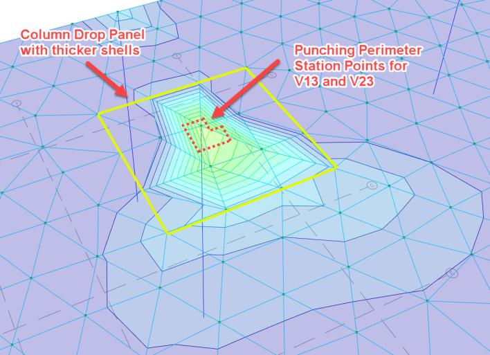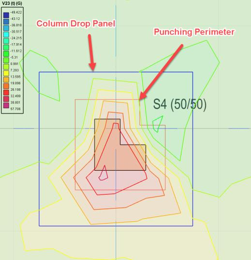 Figures above : Column drop panels, punching perimeters and shear contours shown simultaneously on physical floor plan