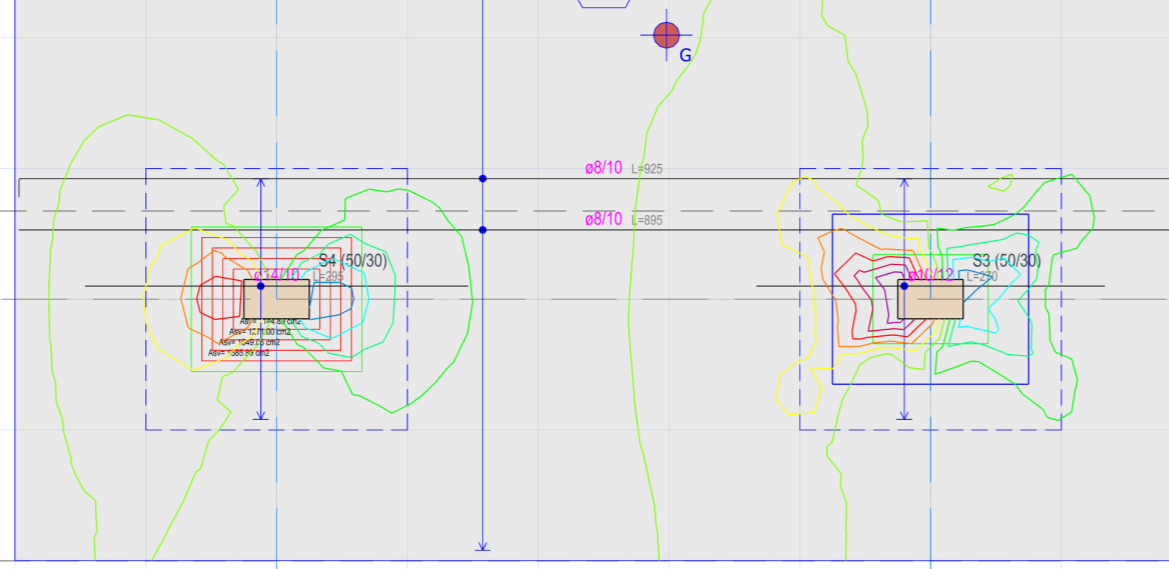 Figure above : Consecutive punching perimeters, V13 contours, column drops, patch regions, patch reinforcement and slab base reinforcement shown on the plan at the same time
