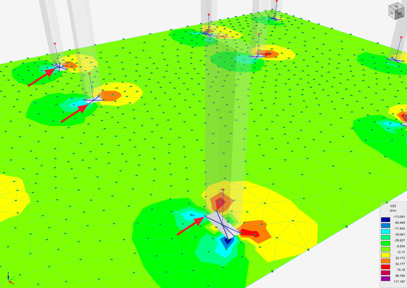 Figures above : V23 shear contours and punching station points for envelope combinations in analysis post-processor.