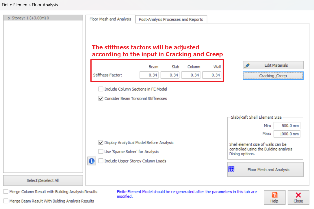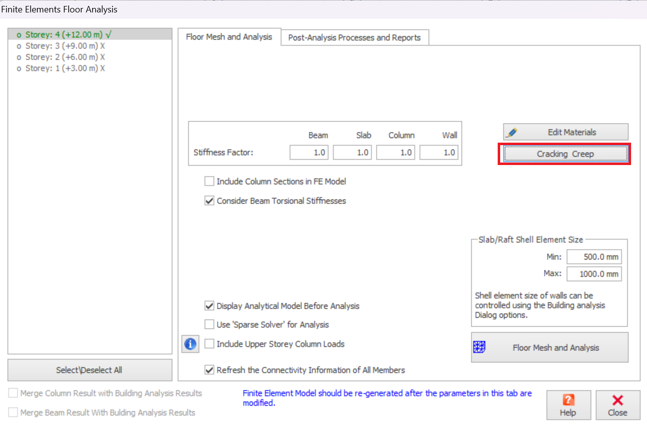 Beam, Slab, Column and Wall stiffness factors can be set automatically to make an allowance for cracking and creep. An automated calculation is provided for this purpose as explained below, Cracking & Creep Calculator