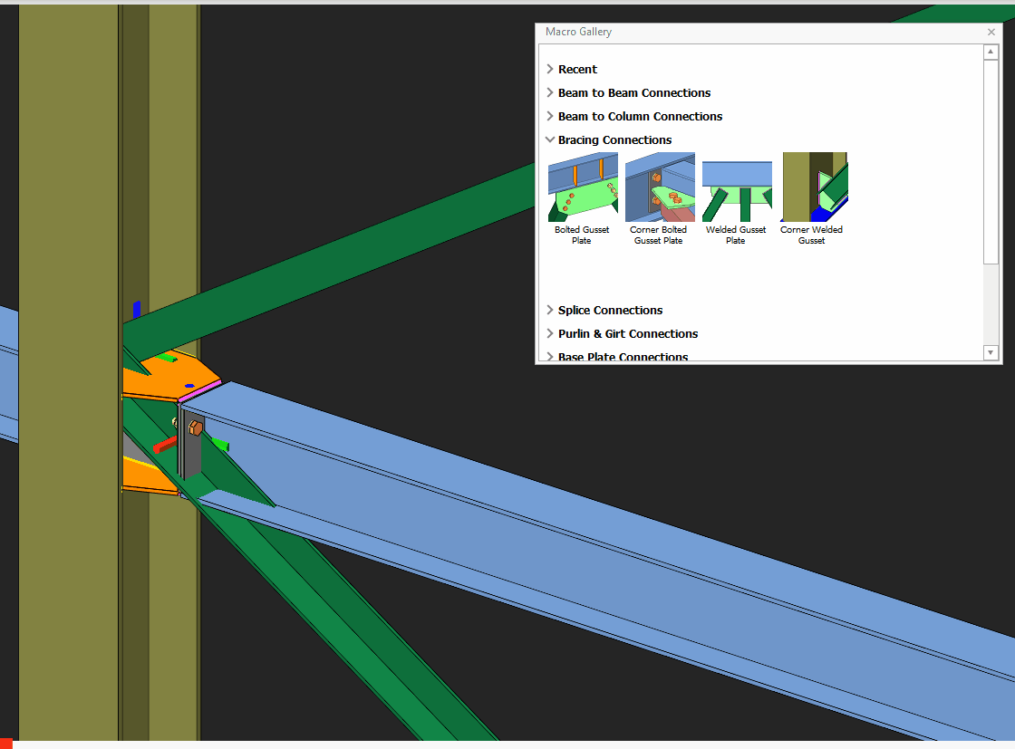 Placing the mouse cursor over the Corner Bolted Gusset Plate Connection Macro will reveal the tooltip describing the scope and steps of this macro.