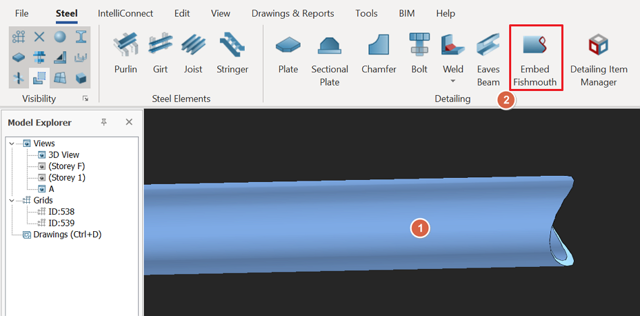 - Select the cut pipe member and click on "Embed Fishmouth" icon to embed fishmouth information.