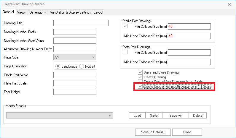 - In Part Drawing Setting, check option "Create Copy of Fishmouth Drawing in 1:1 Scale".