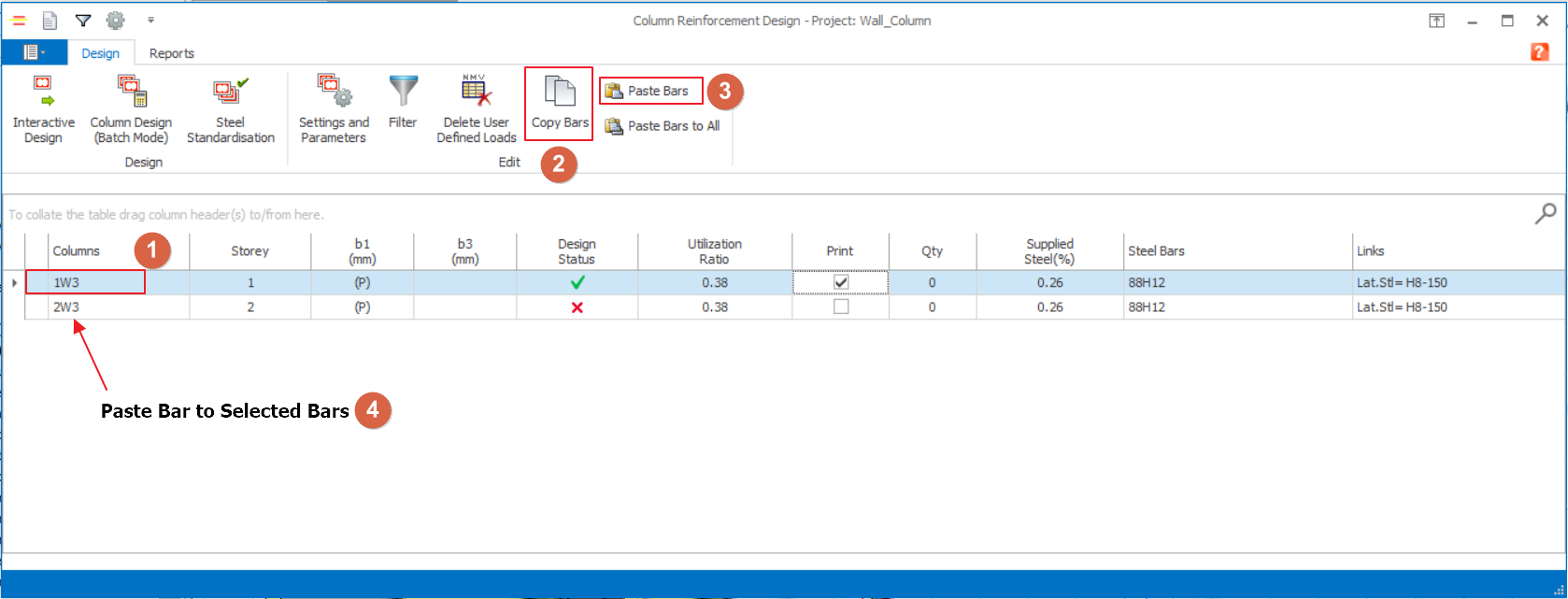 After you define the reinforcement layout for one of the merged walls, you can copy and paste the bars of this merged walls to other similar merged walls by following the steps below: