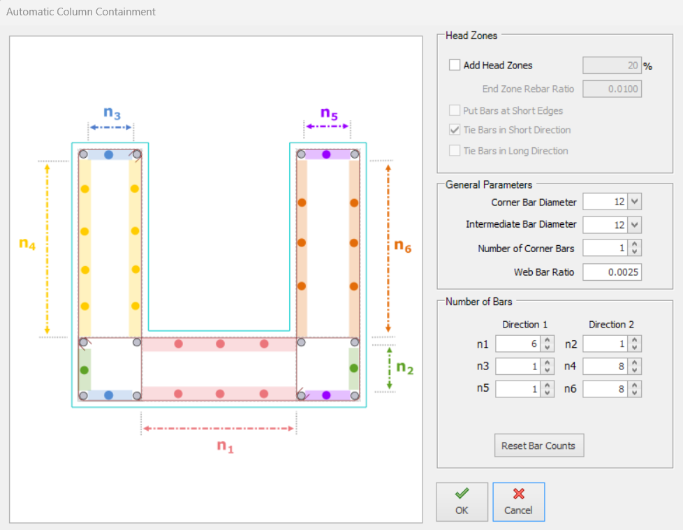 1. In the dialog,  users are able to define Head Zones, General Parameters and the Number of Bars with respect to the parts of the merged wall denoted by "n" in Direction 1 and Direction 2.