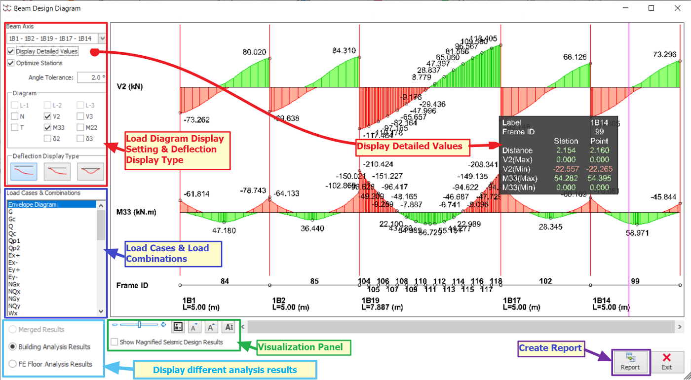 Member analysis results for can be viewed in Detail Design Diagram after running the Building Analysis. Forces such as moment, axial loading, torsion, shear and etc. can be reviewed here.