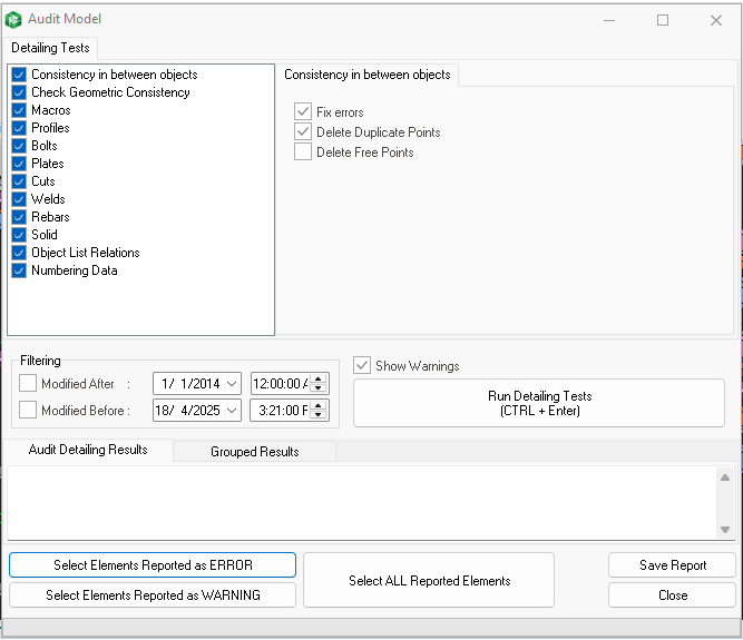 4. If model consists of modelling errors, it will list down the errors in "Audit Detailing Results" or "Grouped Results" box.