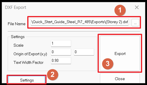 - To export click on "Export" button and the drawing will be exported to the selected file path (stated in step 1).