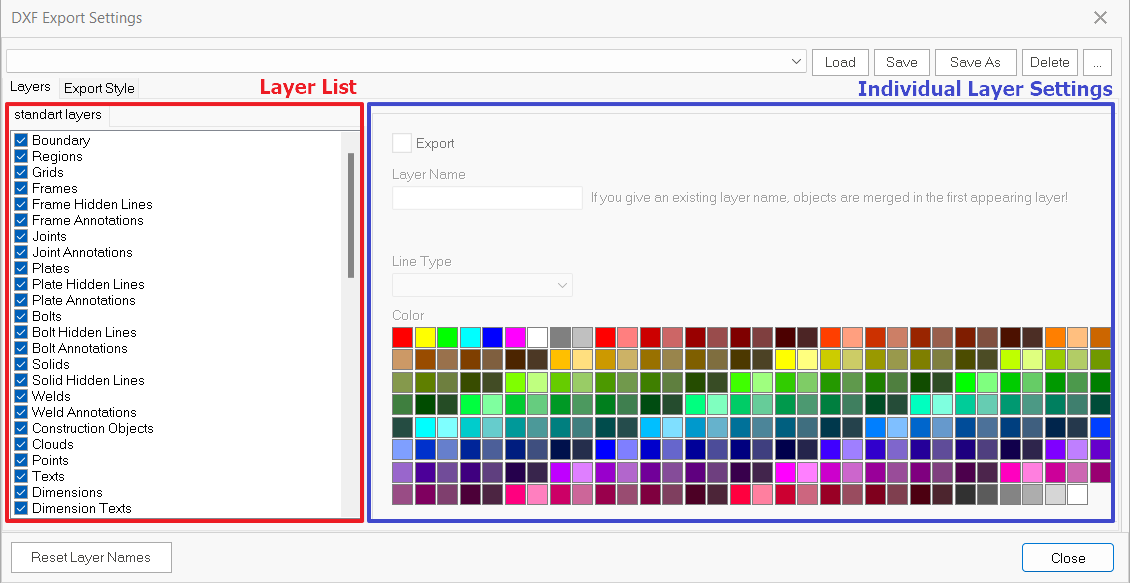 - In this tab, user may adjust/modify the layers colour, name and line type by selecting the particular layers in the layer list.