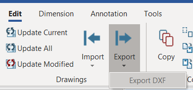 User can easily export drawing as DXF in "Drawing Module" by going to "Edit" top menu> Export > Export DXF