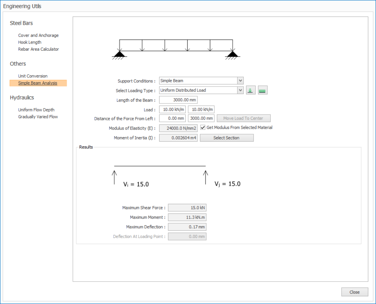 lengths; simple beam analysis tool to calculate maximum shear, moment and