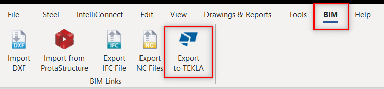 - In ProtaSteel, go to 'BIM' tab – click 'Export to TEKLA'.