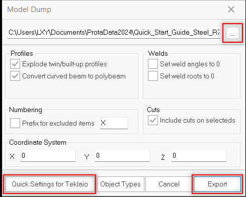 Steps to export a building model from ProtaSteel to Tekla Structures: