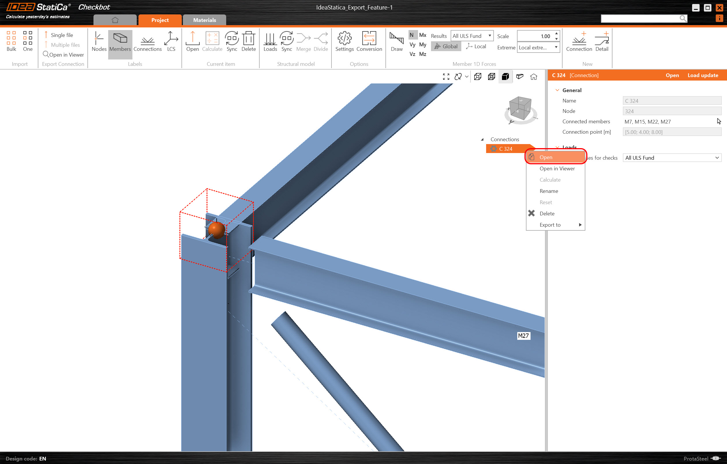 Right-click on the connection ID and click "Open" to open the joint model in the IDEA StatiCa Connection app.