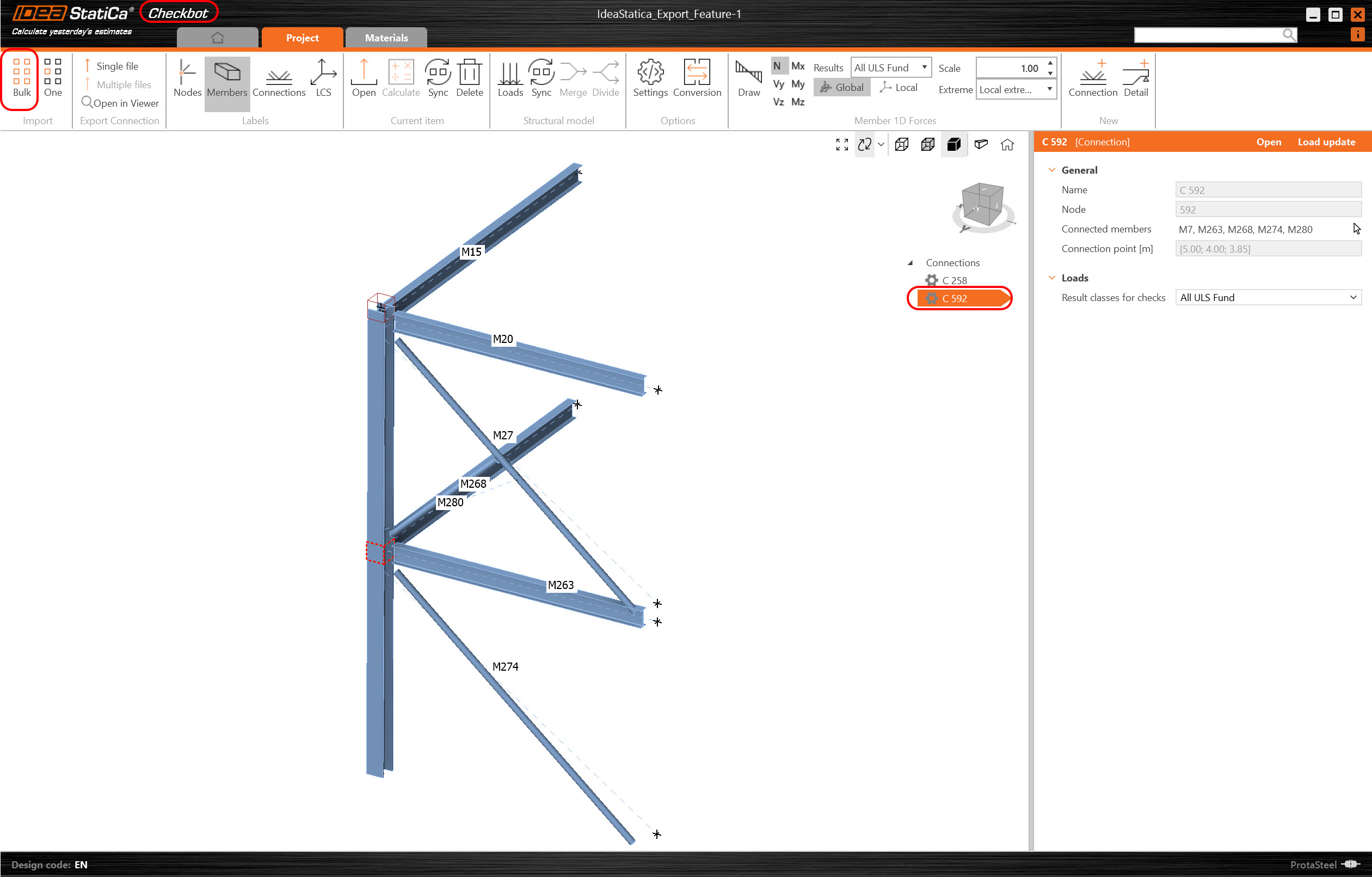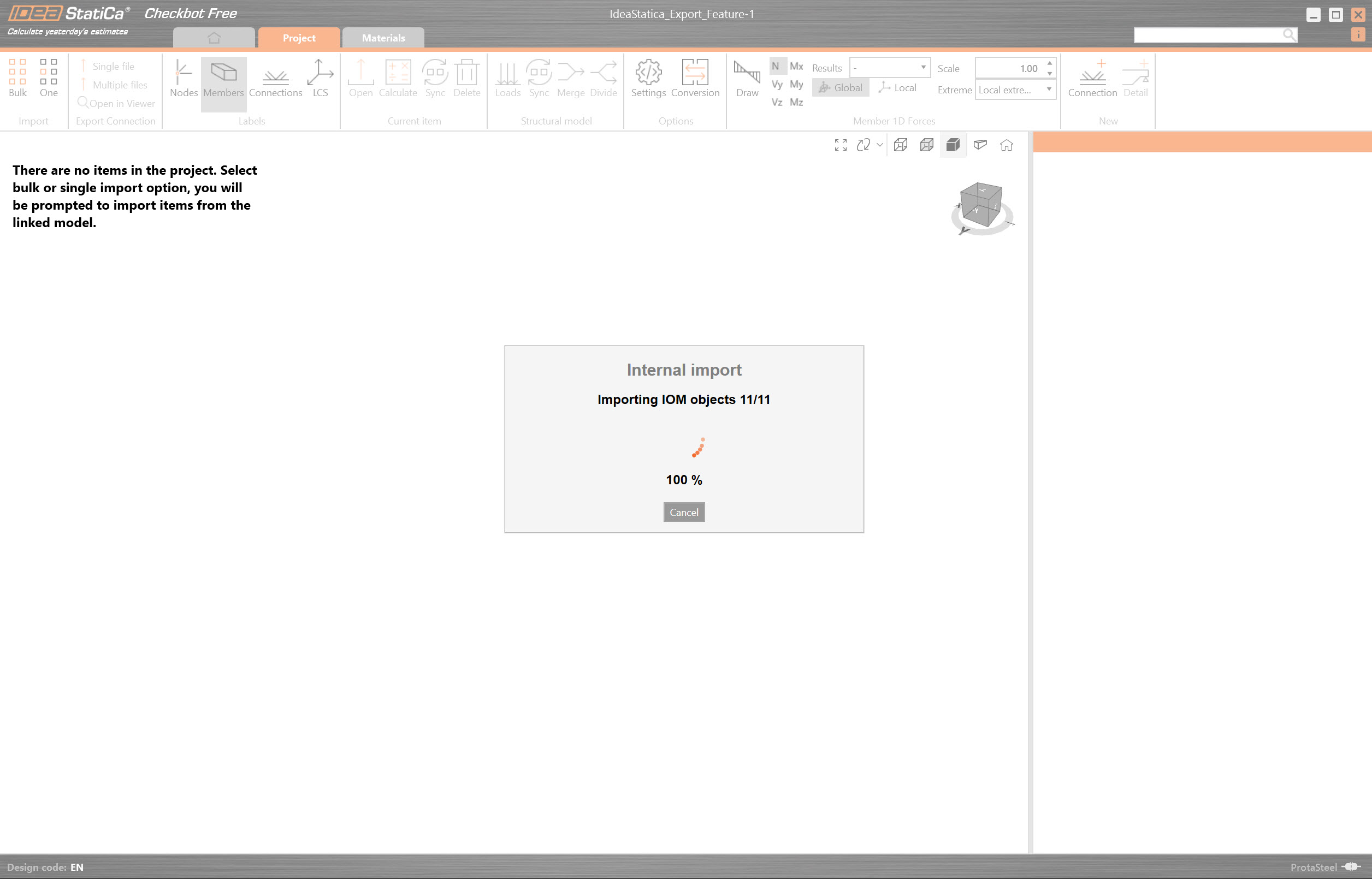 Return to IDEA StatiCa. Once the "Importing IOM Object" process is completed at 100%, the structural members will be displayed within the Checkbot interface.