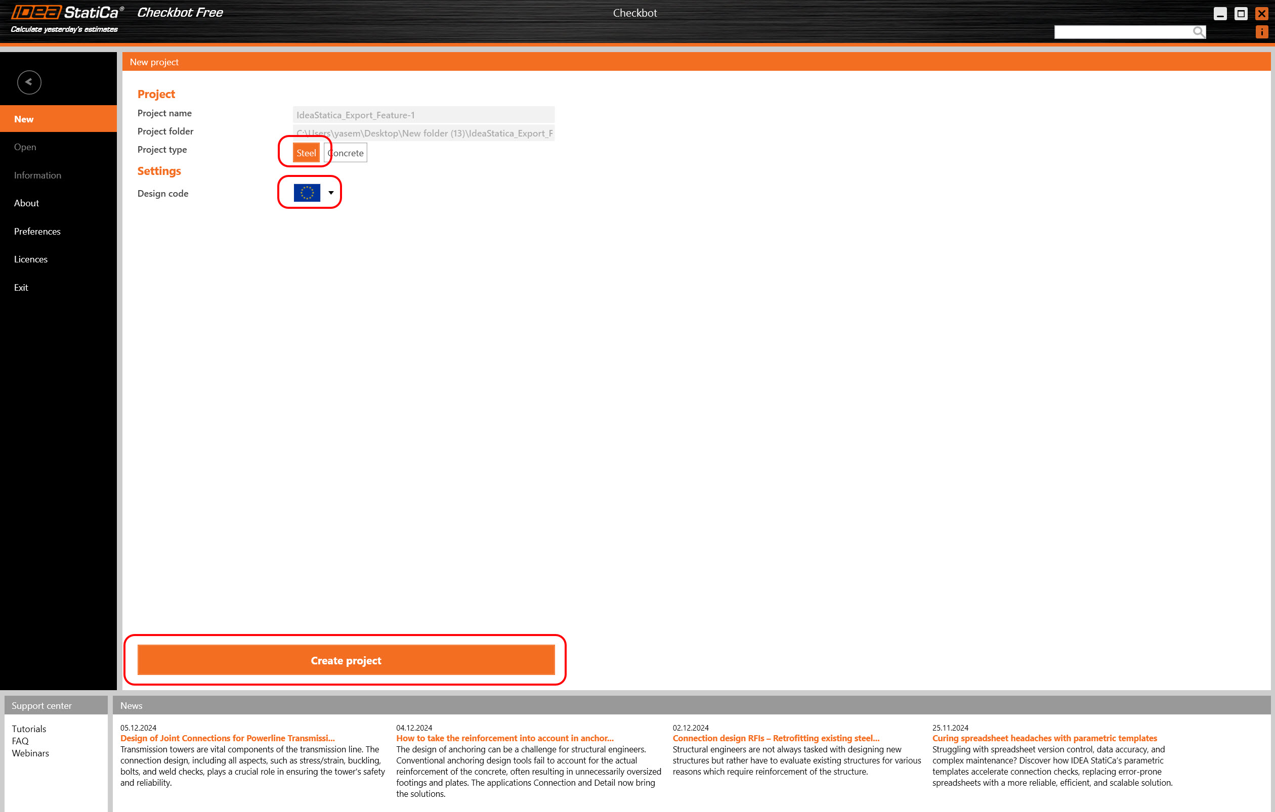 Select the New option with project type Steel and design code such as EN. Then select Create Project.