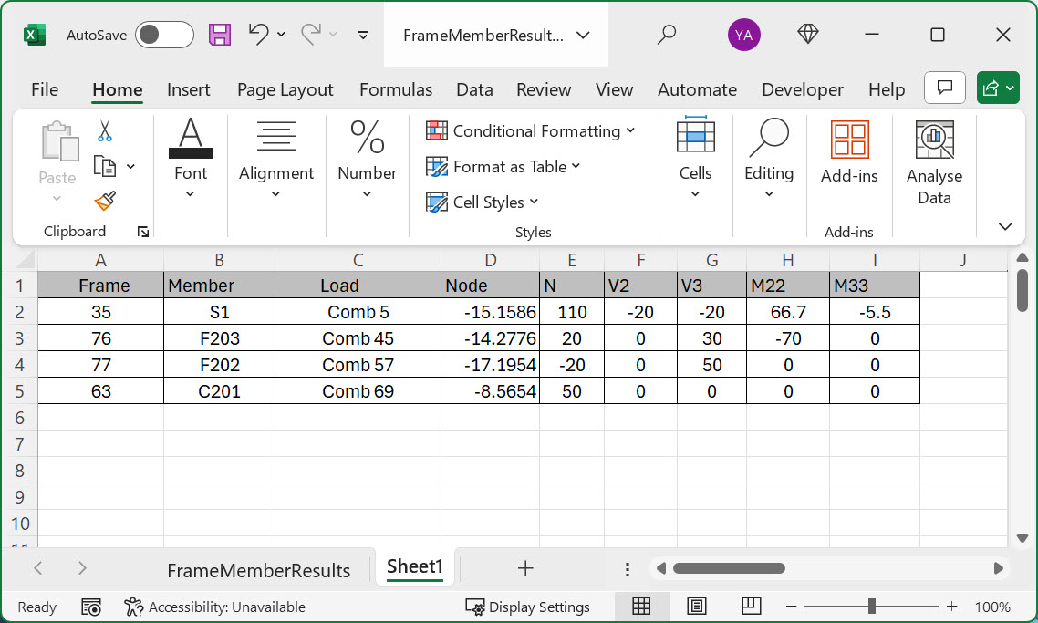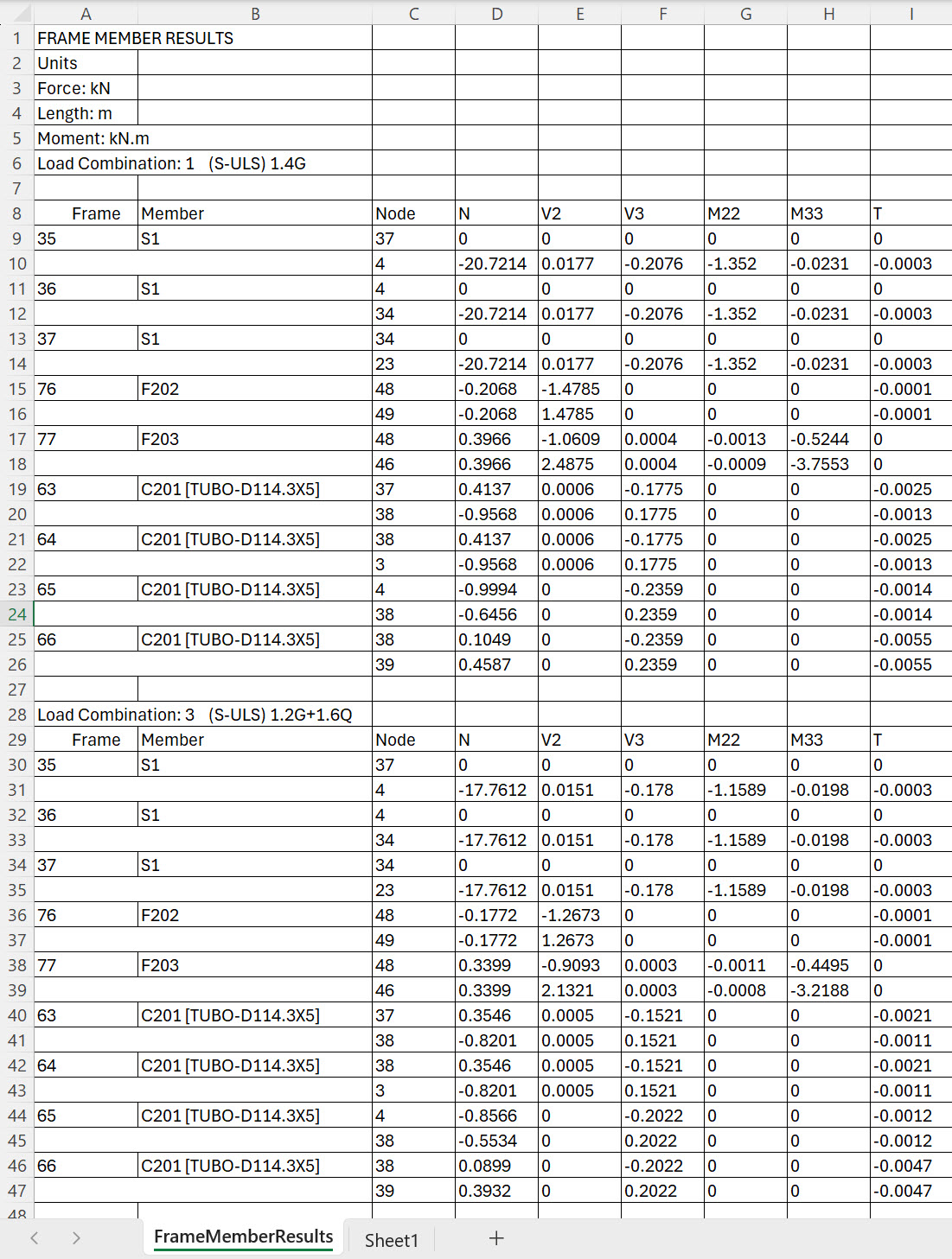 ProtaStructure can generate the internal forces in a CSV file, which can be easily viewed and edited in Excel.