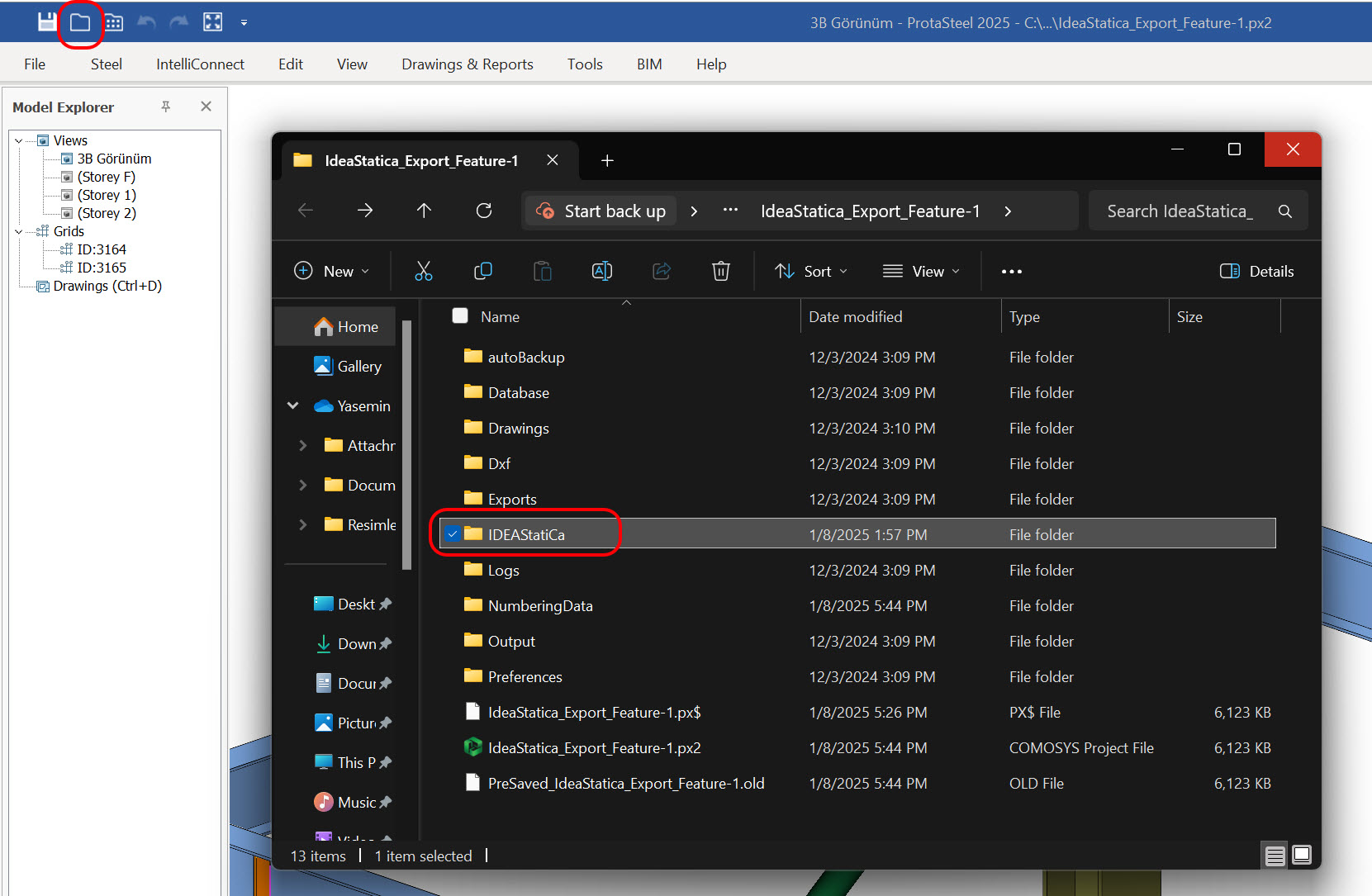 The file generated by Checkbot is stored in a folder named IDEAStatica within the ProtaSteel project directory.
