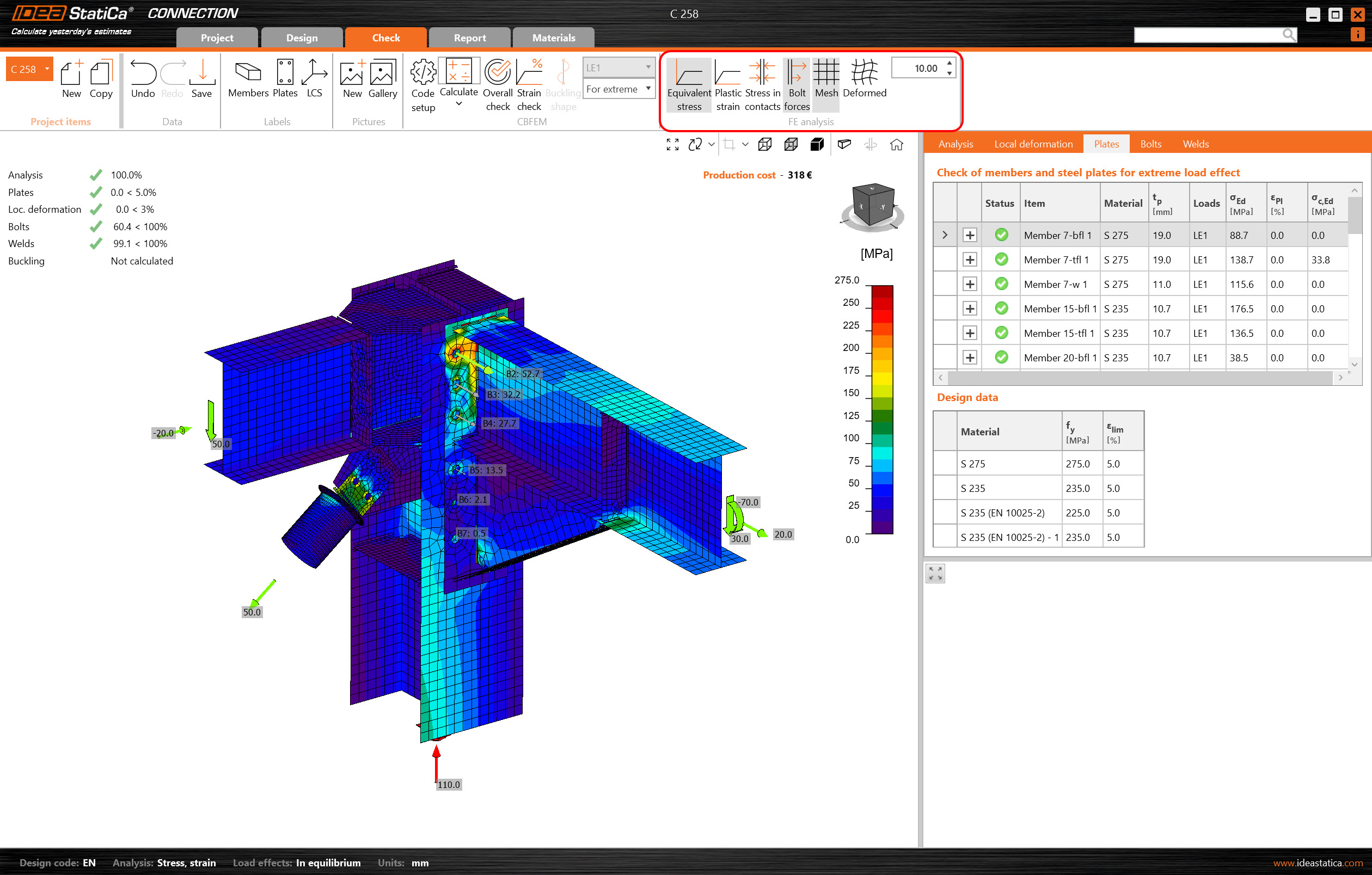 ProtaSteel provides detailed design reports for a large of steel connections using analytical methods. However, you may want to check the design of complex or user-defined steel connections in your project with Component-Based Finite Element Analysis.