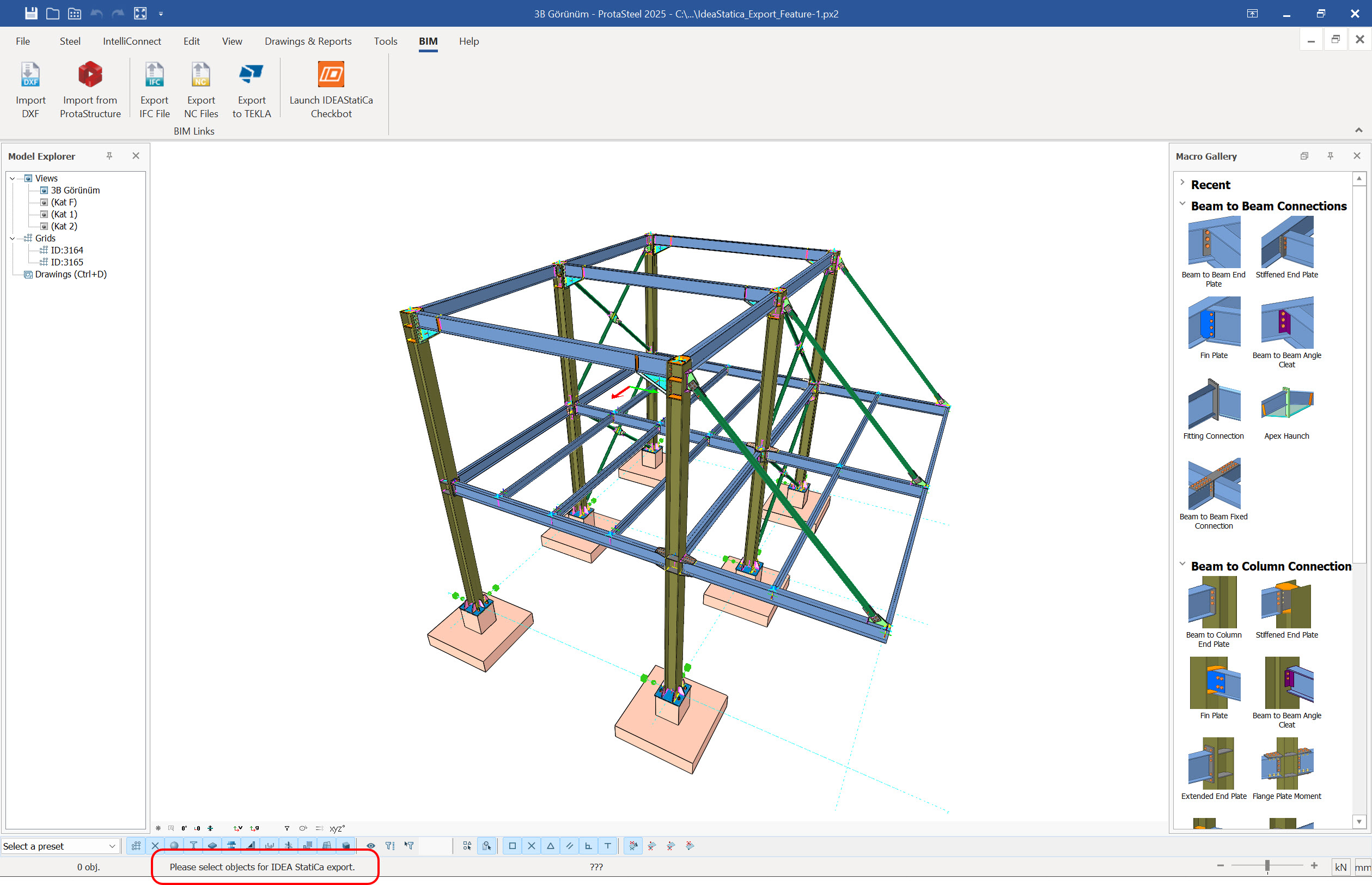In the toolbar below, you will notice the "Please Select Objects for IDEA Statica Export" prompt displayed.