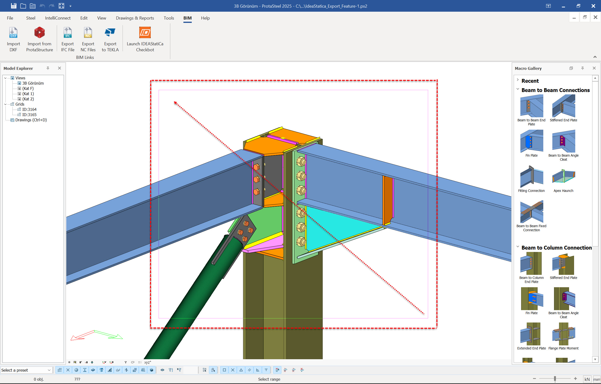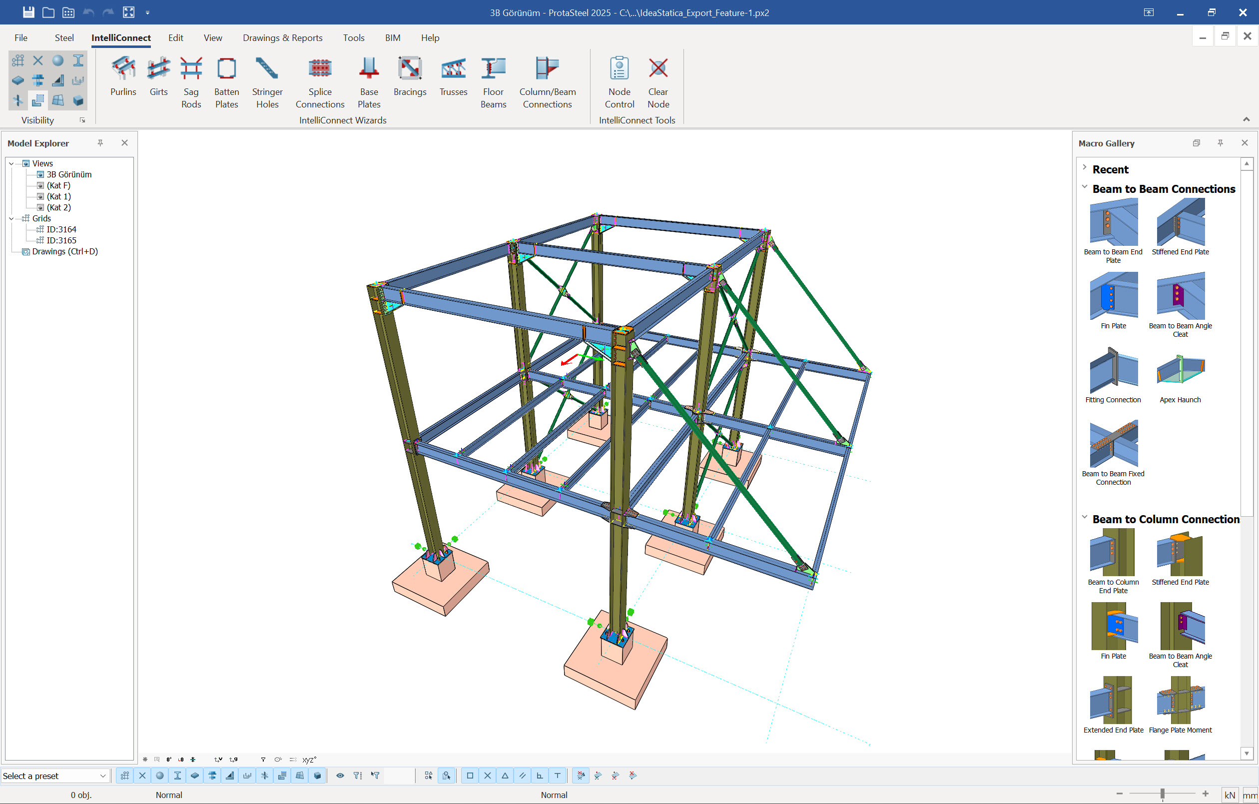 Export the structural model you have completed analyzing in ProtaStructure to ProtaSteel, and create the connection details using macros or manual connection tools in ProtaSteel.