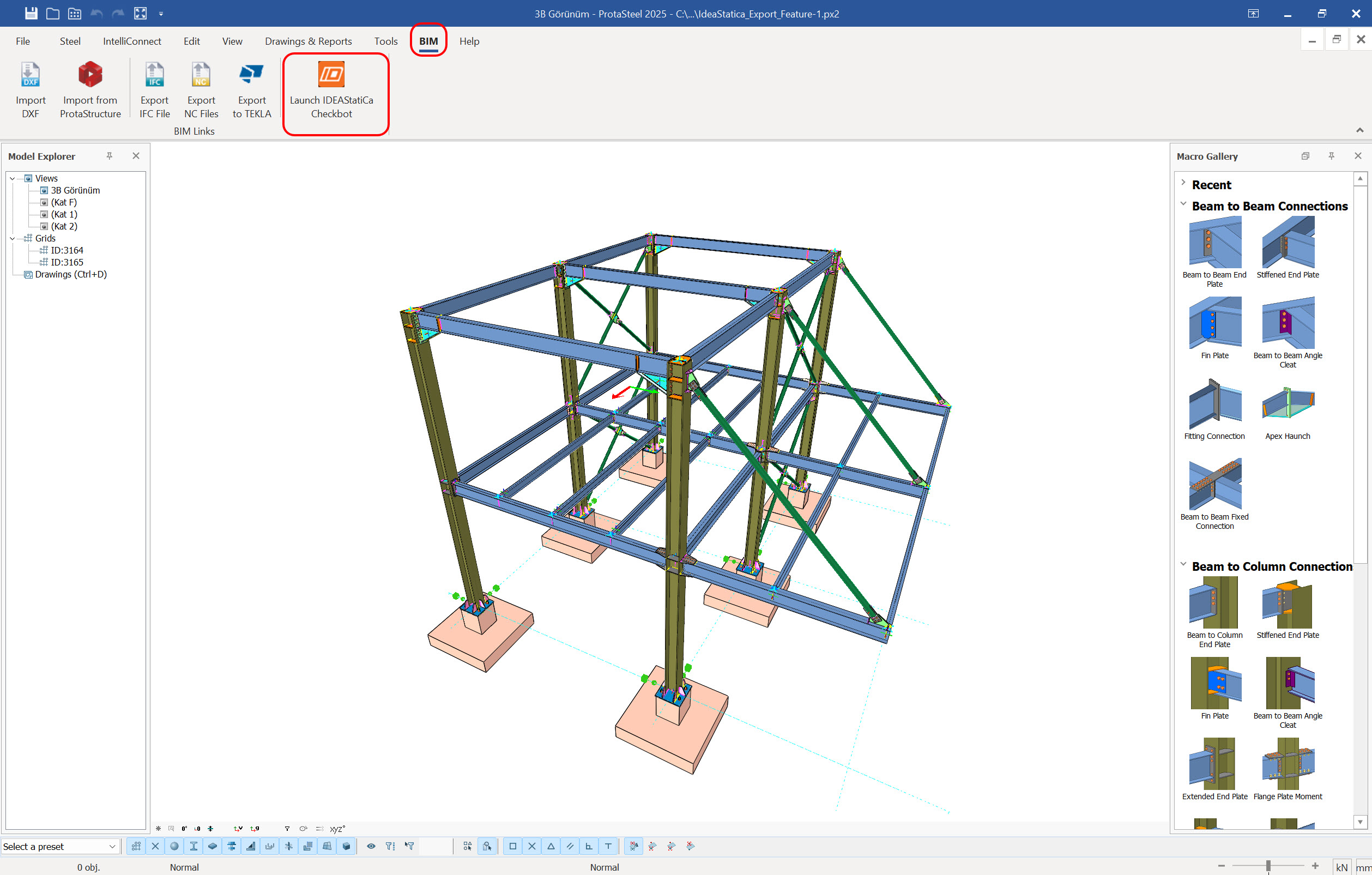 - Checkbot located in the BIM top ribbon menu. Run "Launch IDEAStatiCa Checkbot" without making any selection to transfer the connections from ProtaSteel to IDEAStatiCa.