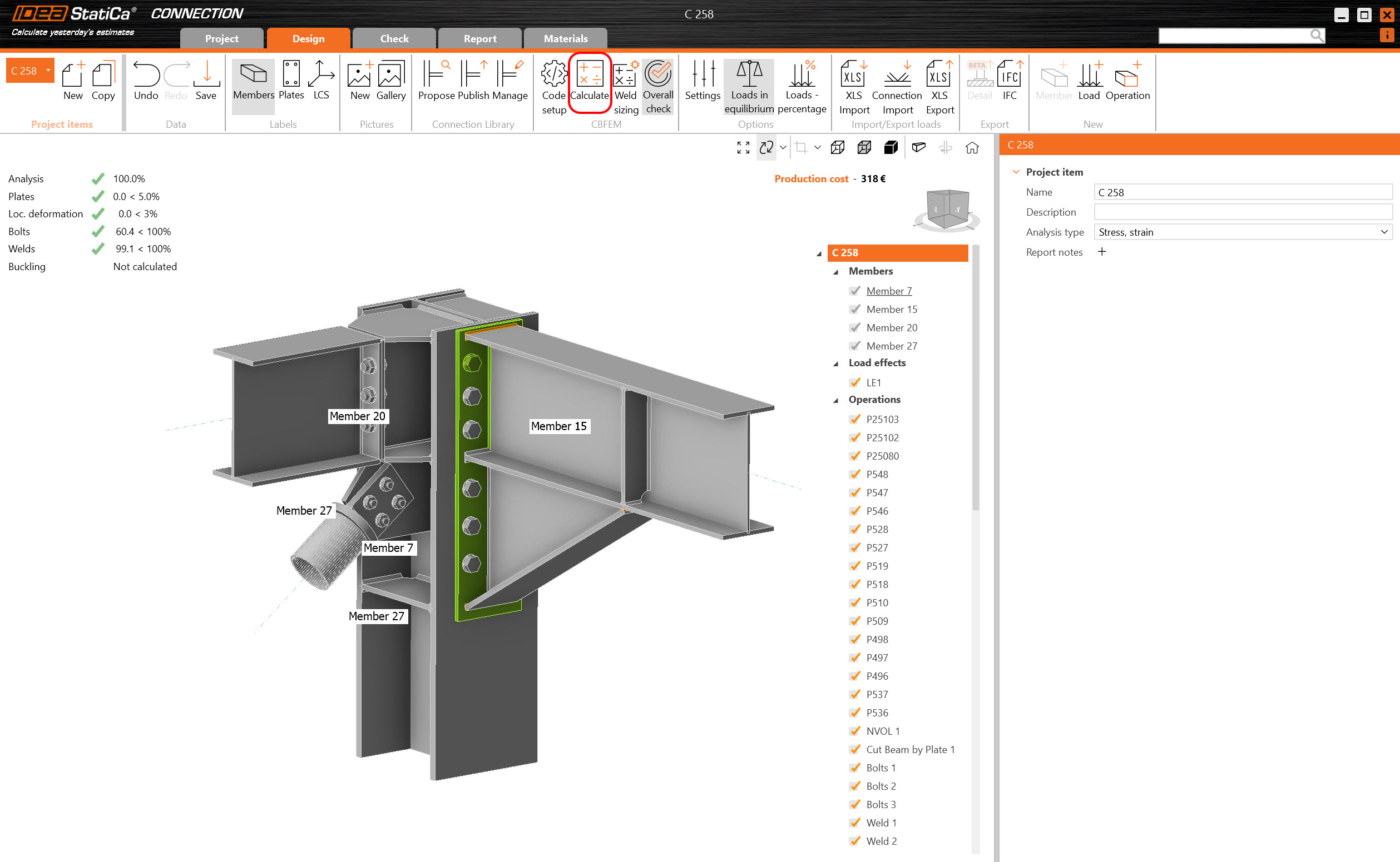 Run the analysis with the "calculate" tool in the CBFEM panel to check the connection detail.