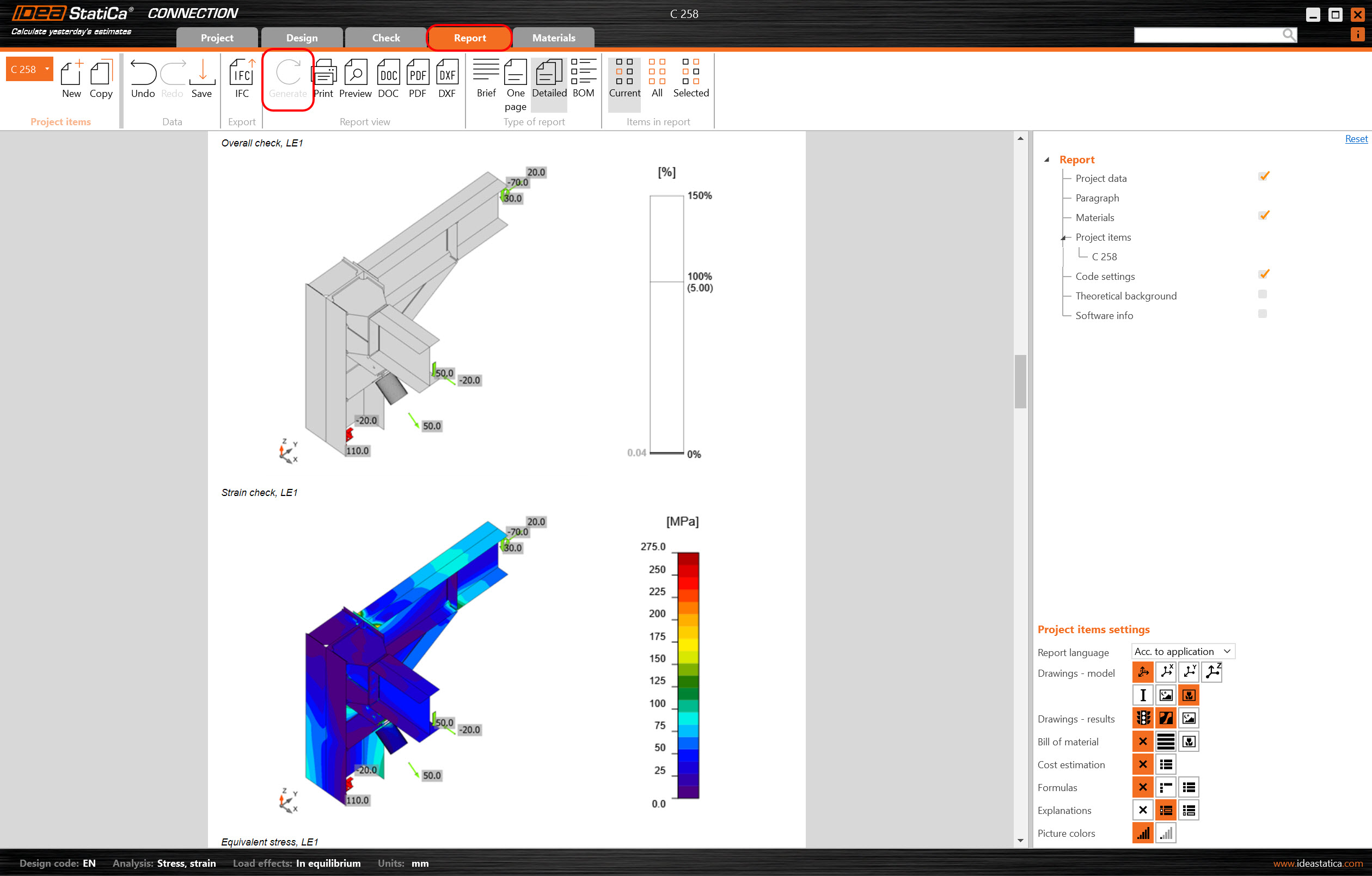 Once the code-check is finished in the Report tab you can create the report containing results and diagrams for your connection model. The report can be printed or saved in several formats.