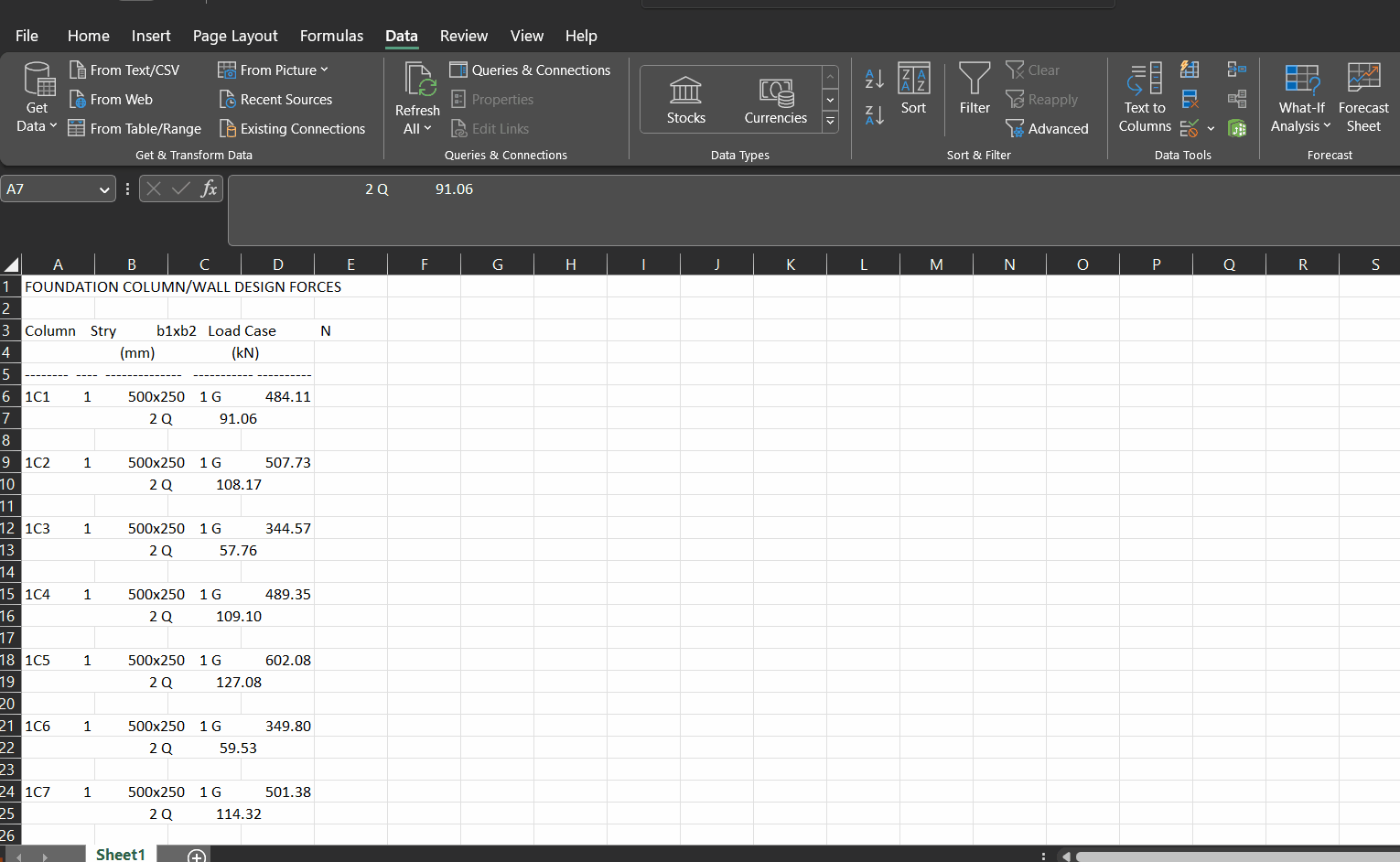 If you would like to generate the column/wall forces to excel format, please go to Design Tab > Columns > Reports > Columns forces listing, to generate the forces in notepad first. Then copy all the data into Excel and use the function "Text to Column" to split the text into multiple columns (refer to snapshot below). Attached GIF for your reference.