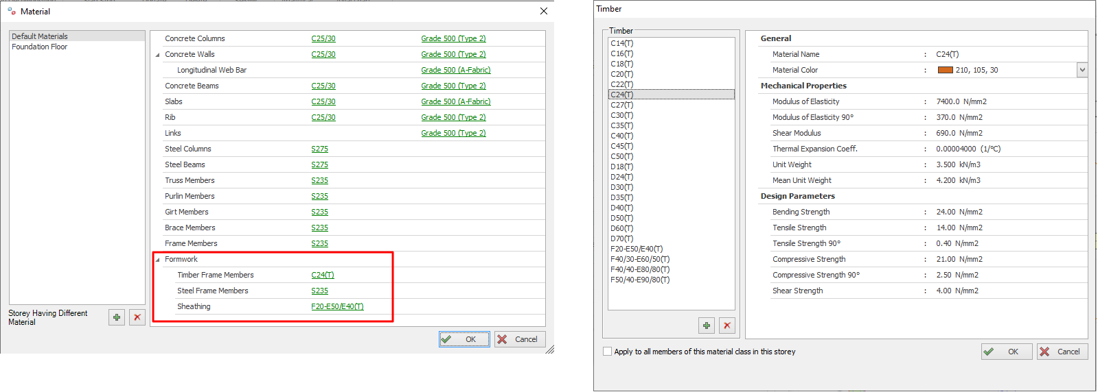 Timber materials are introduced in ProtaStructure to be used in joist, stringer, and shoring calculations. Timber materials and sections are currently limited to formwork members only. We plan to enable them for other structural members in the future. Timber material strengths are compatible with EN 12369-1, EN-12369-2, and EN-12369-3