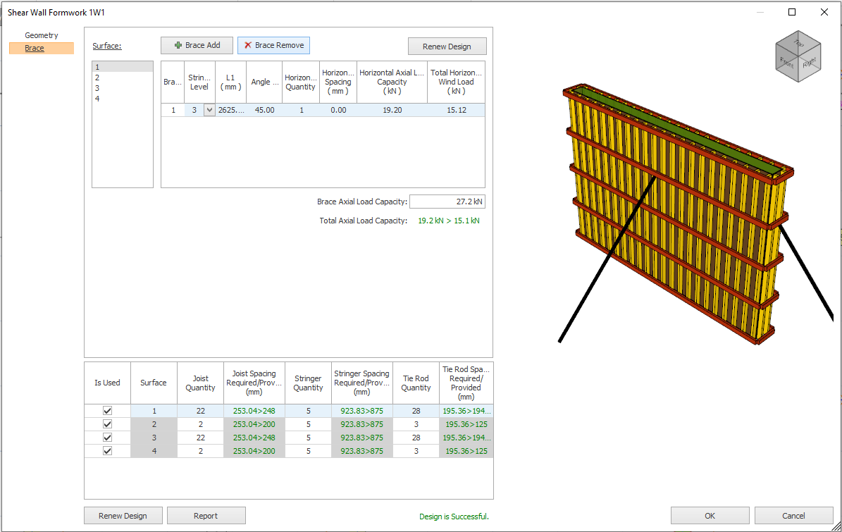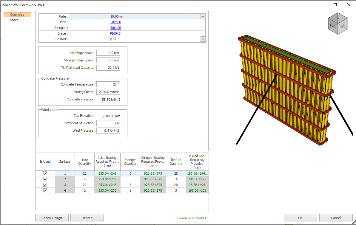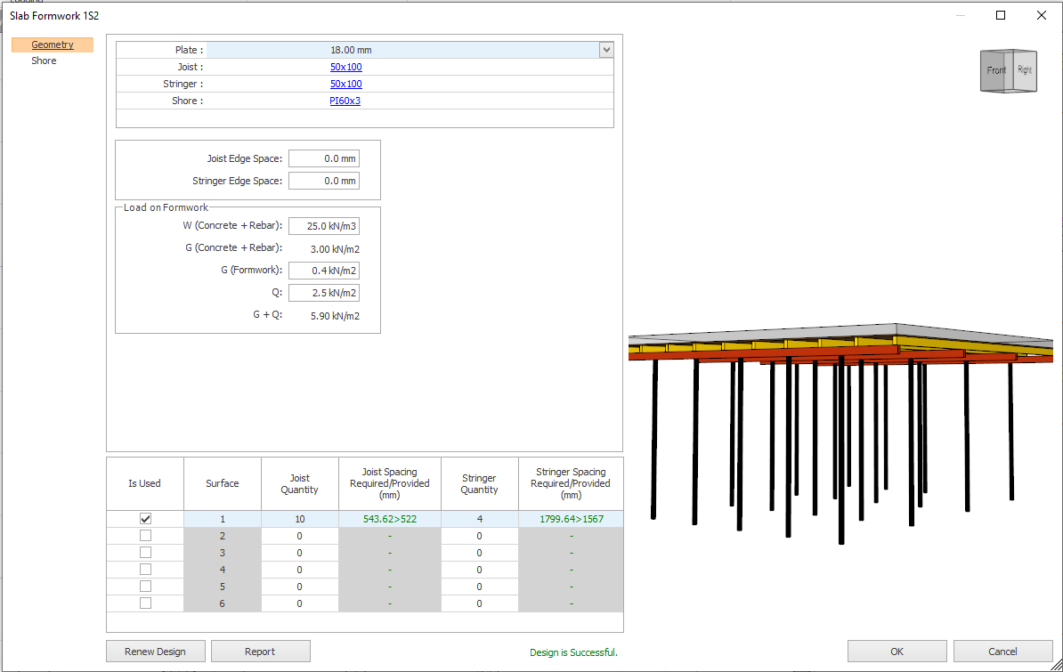 The summary table is organized with respect to formwork surfaces. Depending on the structural configuration, you can uncheck the “Is Used” parameter to remove a surface from the formwork assembly. This option may be helpful if another member is a natural boundary for the designed member.