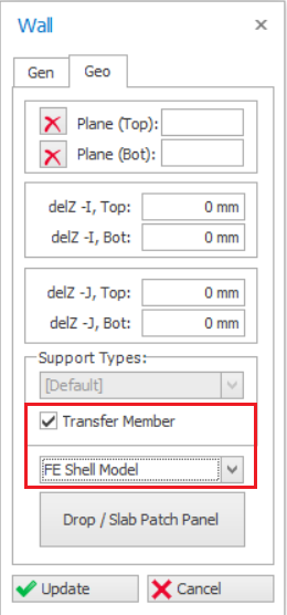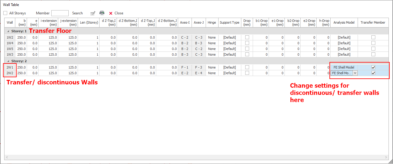 - In the members tab, transfer/ discontinuous walls will be listed here. You can change Wall Model to "FE Shell Model" and check "Transfer Member" option for transfer members.