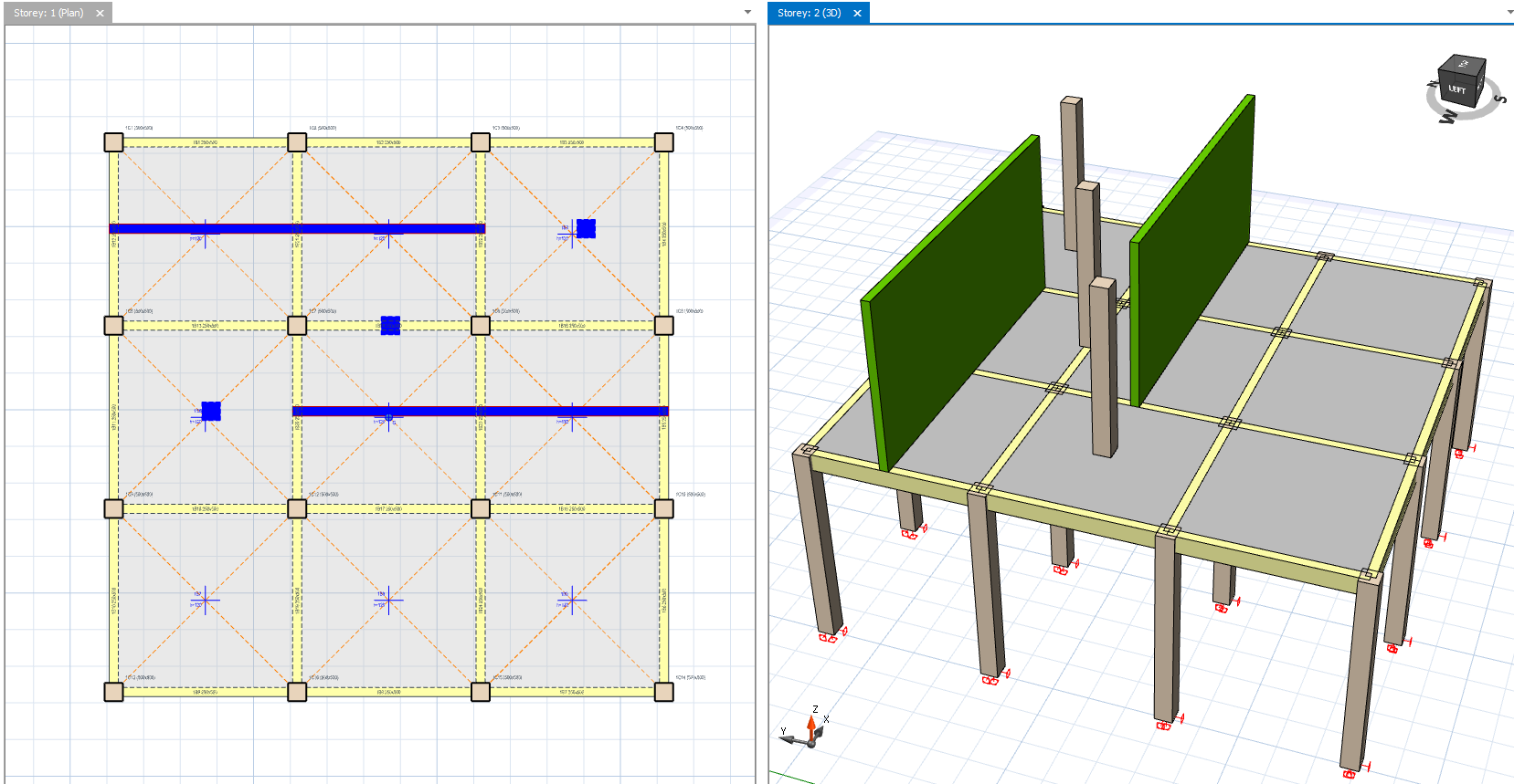The below is a example of a transfer plate. Storey 1 is the transfer level and Storey 2 is the transfer/ discontinuous walls and columns are modelled.
