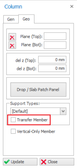 In ProtaStructure, transfer/ discontinuous walls or columns must be defined according to the following settings: