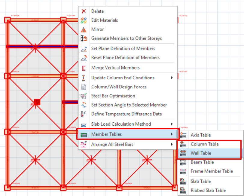 - Right Click > Member Tables > Select Wall Table or Column Table.
