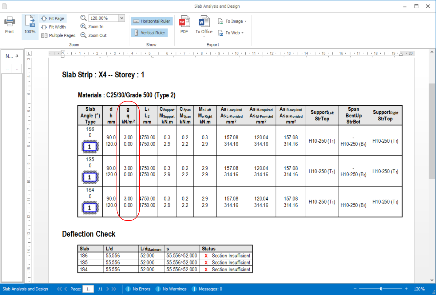 The Slab Design Check Report will indicate the loadings of the slabs respectively. You may generate the Slab Design Report by clicking "Slab Analysis and Design" in the "Design" tab, then click "Design Report".