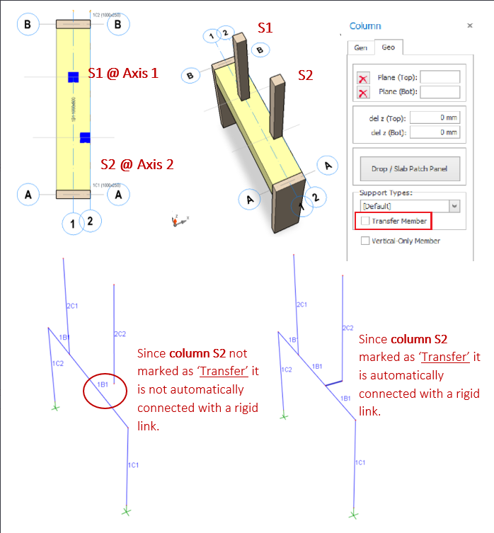 Discontinuous columns & walls must be marked as “Transfer Member” in the Properties > Geometry tab, reasons being :