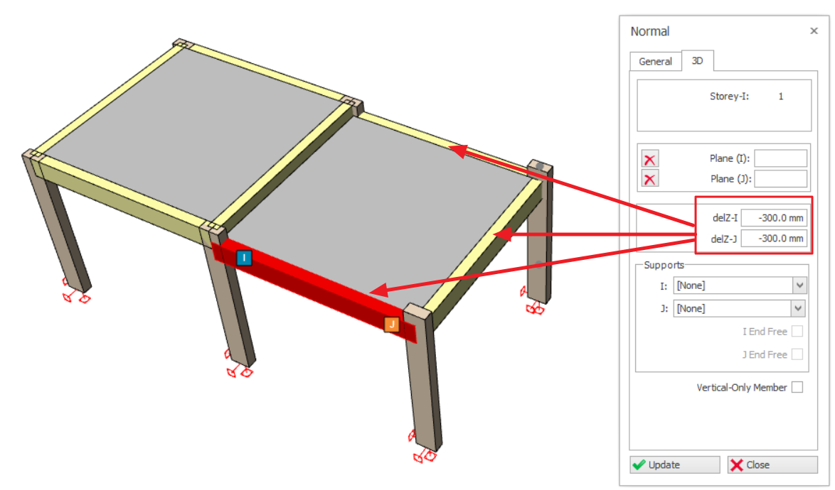 In the example model below, all the 3 beams in the right hand side are lowered (dropped) by 300mm.