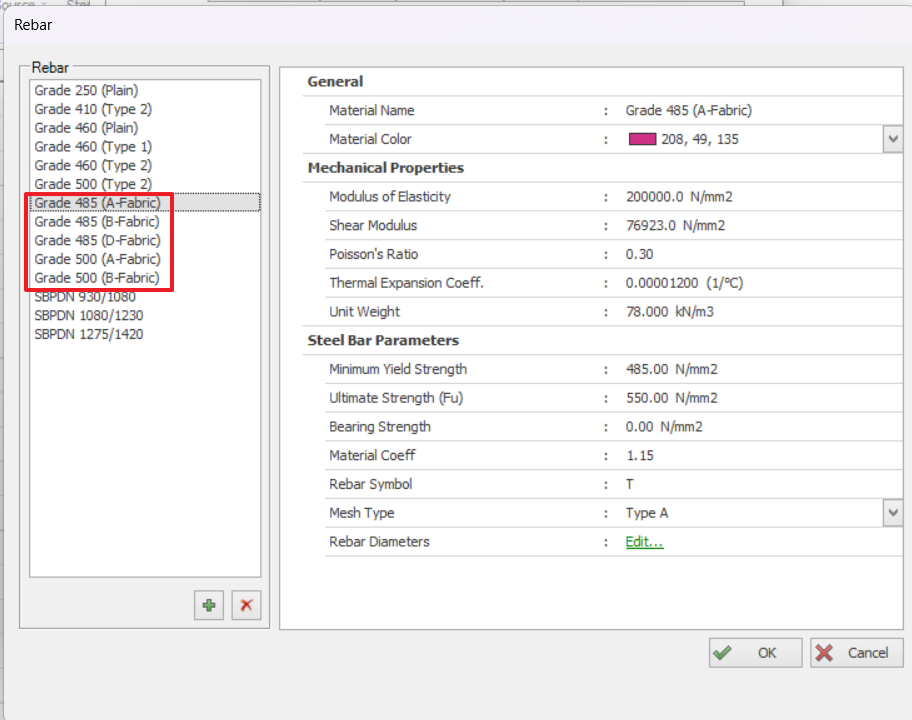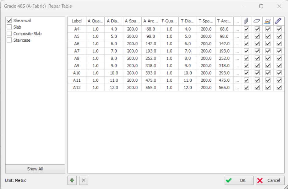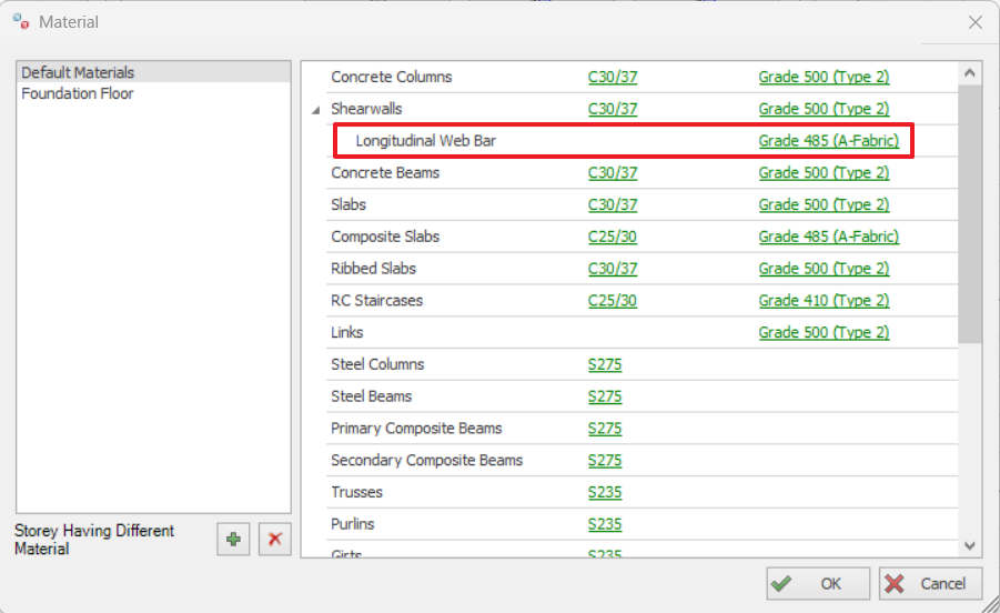 In Building Analysis menu > Edit Materials > Shear walls > Longitudinal Web Bar > Pick a Fabric Rebar
