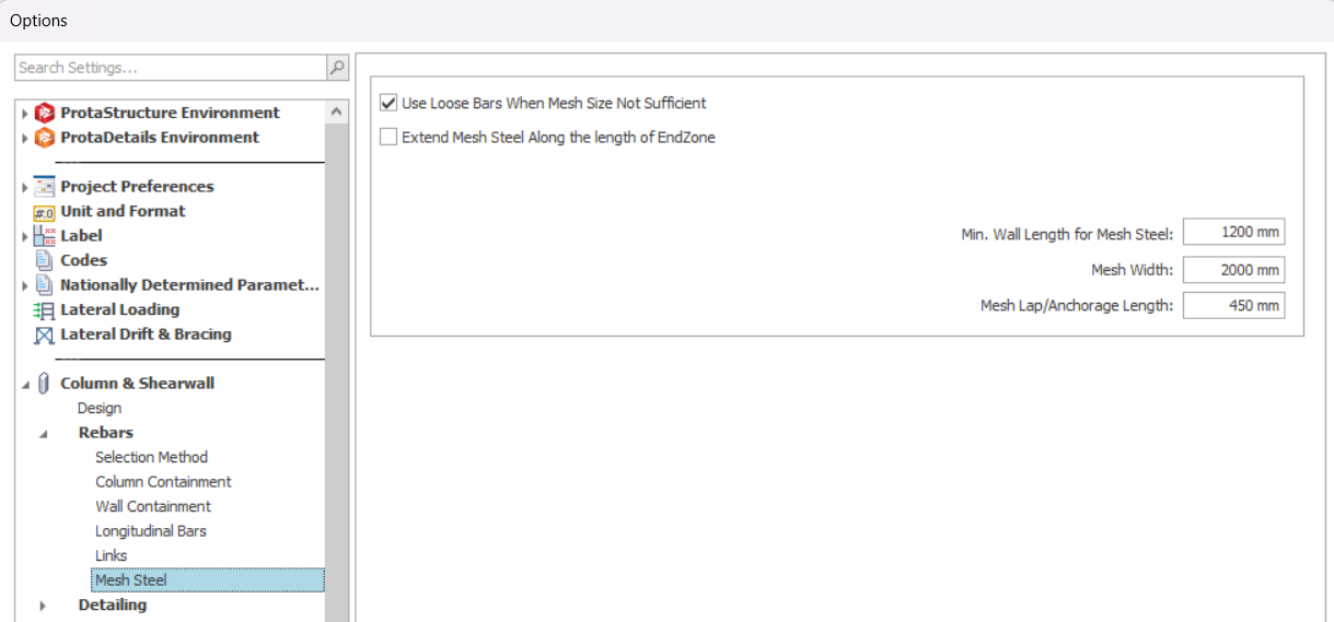 Go to Column & Shear wall Design Settings > Review the Mesh Steel settings to your preference.