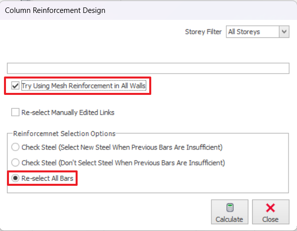 In the Column Reforcement Design Batch mode > checkTry Using Mesh Reinforcement in All Walls