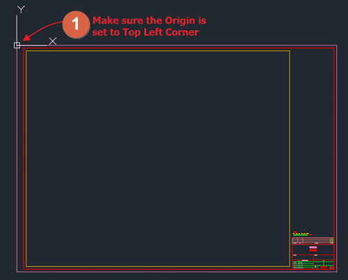 - Ensure the origin (can be checked based on the location of the axis X and Y) of the titleblock drawing is set to top left corner of the titleblock and saved as .dxf format.