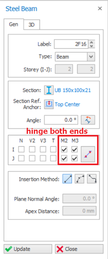 To use this IntelliConnect category, ensure that the beam to beam connection is hinged (simply supported/moment released) in ProtaStructure. If the beam is fix ended, the IntelliConnect will not run. In ProtaSteel, set to "Line" view mode, green dot at the member end indicates hinged end.