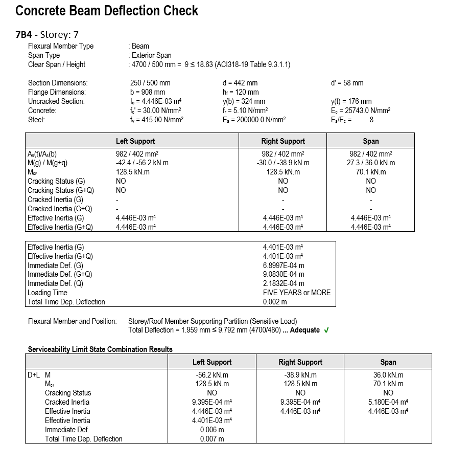 In this check, the effective section inertias are calculated considering the provided reinforcement and design moments. Then, support and span cracking status are determined. Deflections are obtained using the effective inertias according to the SLS combinations defined by the user and the serviceability conditions given in the codes.