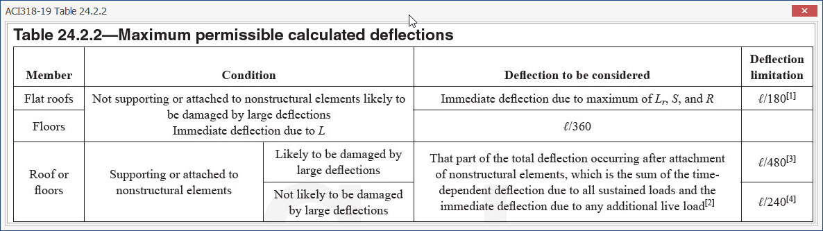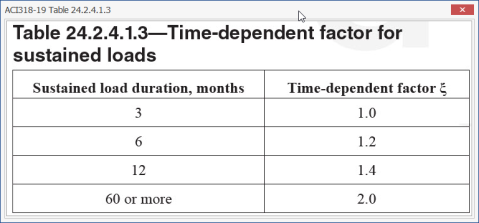 Long term deflections are also calculated using code-specified time-dependent factors and sustained load durations. Results are given in a detailed tabulated report (example for ACI below)