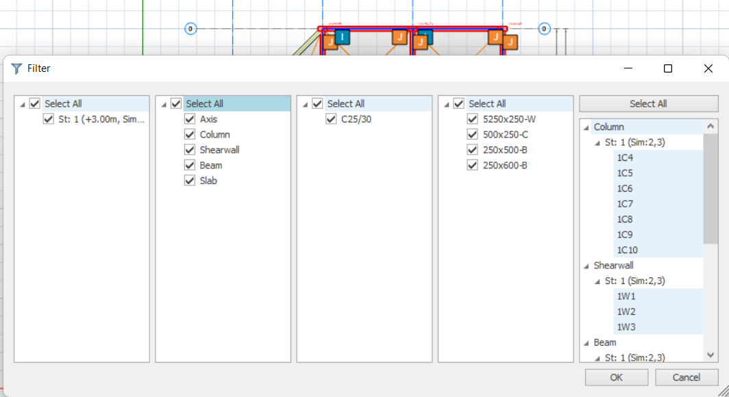 It is useful to use the above Filter Selection dialog to show or hide certain members, in Plan or 3D view.